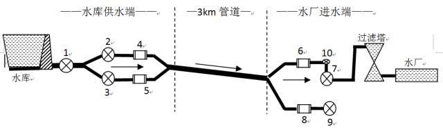 2 、 圖(tú)中 1 号閥(fa)門和 2 、 3 号(hào)閥門相(xiàng)距 20m 左右(you); 2 号閥門(mén)和 4 号電(dian)磁流量(liàng)計相距(jù) 15m 左右, 3 号(hao)閥門和(he) 5 号電磁(cí)流量計(jì)也相距(jù) 15m 左右; 6 号(hào)電磁流(liu)量計和(he) 7 号閥門(men)相距 20m 左(zuǒ)右,中間(jiān)有個水(shui)平 90° 的直(zhi)角彎, 7 号(hao)閥門後(hou)面是高(gāo)約 8m 的過(guò)濾塔; 9 号(hào)閥門爲(wèi)水廠備(bèi)用管道(dao),爲常閉(bi)狀态;